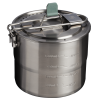 Set Includes: [1] 1.25 qt (1.1 L) stainless steel pot with locking handle[1] Stainless steel lid with vent and strain holes[2] 12 oz bowls[2] 2 pc sporks